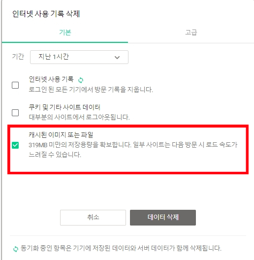 3. 웹 브라우저 : 웨일 : 오른쪽 상단 (점세개) 설정->방문기록 ->인터넷 사용기록 삭제 -> 캐시된 이미지 또는 파일 클릭 후 데이터 삭제.