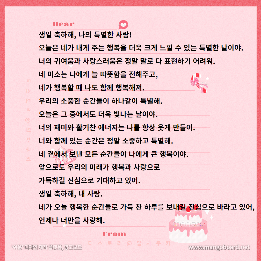 너의 생일이 너무나 특별한 순간이 되길 바라며, 네게만의 특별한 행복한 순간들이 가득하기를 기대해. 축하해, 내 친구!